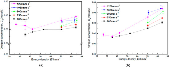 Figure 12a,b shows oxygen and nitrogen concentrations of as-built Zr-1Mo alloys as a function of energy density. Oxygen and nitrogen concentrations increased with increased energy densities. It was also found that these concentrations at higher energy densities increased with increasing scanning speed.