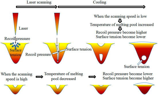 Figure 13 shows schematic drawings of the formation mechanism of randomly distributed pores. When the laser scans the metallic powders, a melt pool is formed, depending on the laser’s power and scanning speed. The surface of the liquid metal becomes dented when the recoil pressure (i.e., the metal vapor pressure) overcomes the surface tension at the melting pool. Due to the extremely high temperature of the melting pool, the evaporation of metallic material during laser scanning could possibly occur, as was reported elsewhere [36,37]. This evaporation could lead to instantaneous volume expansion by solid–gas transformation and then produce pressure on the melting pool. This pressure is known as recoil pressure (pr), which can be calculated by