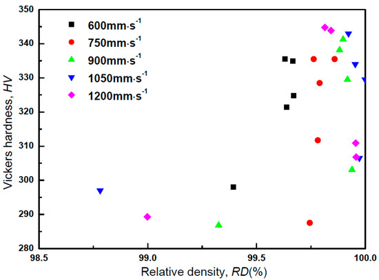 Next, we discuss the effect of scanning speeds on increasing hardness at the same energy density. Juechter et al. [37] reported that lower scanning speeds led to stronger heat loss during irradiation, caused by increasing local interaction times between beam and powder. Higher scanning speeds apparently lead to shorter local interaction times, so that higher scanning speeds effectively apply energy from the laser. Also, due to the narrower hatch distance and higher scanning speed, residual heat from the adjacent scanned lines is effectively available for melting. Therefore, a higher Vickers hardness at the higher scanning speed could be obtained due to the higher actual energy density and residual temperature at the build surface.