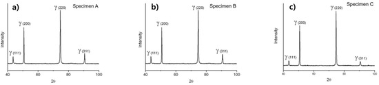 Using a vacuum induction melting under nitrogen partial pressure, three types of austenitic steels were fabricated by POSCO technical laboratory with the chemical compositions as given in Table 1. In order to investigate the effect of nitrogen on DIMT, nitrogen contents were varied by controlling nitrogen partial pressure while the other alloying contents are almost constant in the selected materials. 30 kg-ingots were homogenized at 1200 °C and then hot rolled into 3 mm thick plate at 1050 °C. Pickled in a solution of 10% HCl, the plate was cold rolled into 1.15 mm thick sheet at room temperature. For measuring DIMT kinetics, subsized plate-type tensile specimens with thickness of 1.15 mm, gauge width of 5 mm and gauge length of 15 mm were machined from cold rolled sheets, while tensile tests specimen were machine according to ASTM-E8. Sealed in quartz tube, the specimens were annealed at 1050 °C for 30 min to remove transformed phase probably formed due to machining and then quenched directly into water. Grain sizes were observed to be 40~50 μm for all three types of specimens regardless of nitrogen content. X-ray diffraction tests of as received specimen A, B and C were performed using X-ray diffractometer (Rigaku, Tokyo, Japan) with copper-targeted gun in 40 KeV and 200 mA power. As given in Figure 1, XRD patterns show that all three types of specimens only have austenitic phase. Tensile tests were performed at room temperature under the nominal strain rate of 1.0 × 10−3 s−1 using an electro-mechanical testing machine (Instron, Norwood, MA, USA). The volume fractions of transformed martensite were measured thru a magnetic induction method by using a commercial Feritscope (Fischer, Windsor, CT, USA). To avoid the Villari effect (inverse magnetostrictive effect), Feritscope measurement was conducted with unloading at each strain level [24]. In order to observe the microstructure, the test pieces were polished and then etched using a mixed solution of distilled water, hydrochloric acid and nitric acid with a ratio of 4:3:3. The microstructures of transformed phase were then observed using a scanning electron microscopy (SEM) (JEOL, Tokyo, Japan).