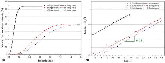 The parameter f and fs denote the volume fraction of transformed α’ martensite and its saturation value, respectively. The parameter β represents austenite stability on a given composition and temperature. Increasing β inversely indicates decreasing stability of retained austenite and the rate parameter n denotes how quickly the nucleation sites are generated during deformation. It is well known that the nucleation site for DIMT is shear band intersection, and the formation of the shear band strongly depends on the loading type and crystallographic orientation in a given composition [1,2,26]. Therefore, the parameter n can also be termed as a deformation mode parameter. ε0 is critical inelastic strain for triggering DIMT. The details on the parameters are shown in elsewhere [10,13]. All parameter are dimensionless and can easily be obtained from experimental data with the Equation (1).