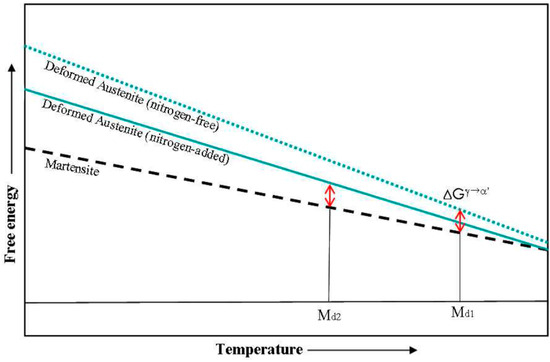 Lee et al. [4] also reported in the study of austenitic 304 stainless steels that Md temperature measured indirectly as the temperature where austenite stability parameter β = 0 decreased with increasing nitrogen contents. Figure 3 can schematically explain the reported decrease of Md temperature with increasing nitrogen contents. In Figure 3, nitrogen-added austenite doesn’t have critical driving force at Md1 as much as nitrogen-free austenite, therefore needs to be cooled below the temperature Md2 in order to be transformed into martensite with the external plastic strain.
