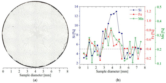 Specimen of Al-5 wt. % Si-0.4 wt. % Fe-0.2 wt. % Mn alloy solidified with temperature gradient G = 3 K/mm, velocity v = 0.04 mm/s and rotating magnetic field RMF B = 6 mT: (a) a cross-sectional microstructure; (b) solute concentration profile—Si, Fe and Mn—measured across specimen cross section.