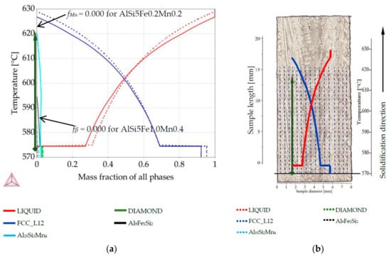 Illustration of phase fraction diagrams application for 2D maps construction. The green arrow and red and blue courses show the connection between property diagram’s temperature axis and longitudinal section’s temperature axis: (a) phase fraction diagram for AlSi5Fe0.2Mn0.2 (solid line) and AlSi5Fe1.0Mn0.4 (dotted line) alloys; (b) longitudinal section with marked sites for mass fraction placement (dashed lines oriented along sample length) and placed mass fraction courses (red and blue).