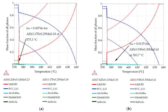 Phase mass fraction diagrams: (a) sample AlSi5Fe0.2Mn0.2, data for points with compositions AlSi8.26Fe0.14Mn0.23 and AlSi3.17Fe0.29Mn0.18; (b) sample AlSi5Fe0.2Mn0.4, data for points with compositions AlSi7.82Fe0.13Mn0.38 and AlSi3.93Fe0.30Mn0.41.