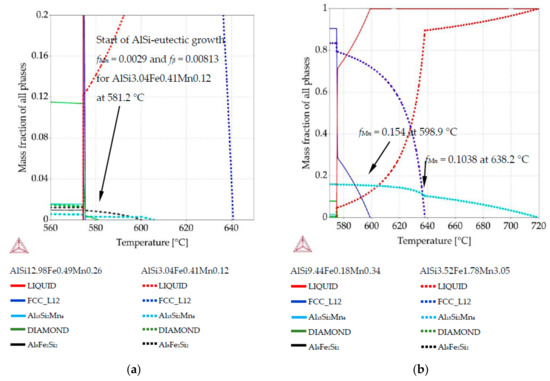 For the specimen AlSi5Fe0.4Mn0.2 (Figure 6a) variations in composition across the specimen caused not just different characteristic temperatures but also a change in precipitation sequence. At the point with very low Si content (AlSi3.04Fe0.41Mn0.12, coordinate 5.6 mm), the first phase to grow is dendritic α-Al, beginning at 640.7 °C, with the mass fraction reaching fα = 0.969 at final solidification temperature 574.5 °C. The precipitation of Al15Si2Mn4 phase starts at 574.8 °C for the high silicon point, reaching fMn = 0.0154 at 574.5 °C and finally fMn = 0.0088 at room temperature. The low silicon composition begins to form Al15Si2Mn4 starts at 605.7 °C and reaches fMn = 0.0052 at 574.5 °C and finally fMn = 0.0042 at room temperature. β-Al5FeSi appears as part of the final solidification reaction at 574.5 °C for the composition AlSi12.98Fe0.49Mn0.26, but at 600.1 °C for AlSi3.04Fe0.41Mn0.12 and reaches fβ = 0.0123 at 574.5 °C. The opposite behavior is observed for the point with very high Si content (AlSi12.98Fe0.49Mn0.26, coordinate 4.5 mm) where the first phase to grow is AlSi eutectic, starting at 581.2 °C and where it is main and predominant phase in such the alloys. At 20 °C, β mass fraction reaches fβ = 0.0182 for AlSi12.98Fe0.49Mn0.26 and fβ = 0.0154 for AlSi3.04Fe0.41Mn0.12.