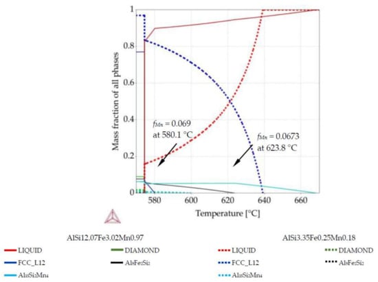 Thermo-Calc [17] was used to calculate ternary phase diagrams (Figure 3 and Figure 4) as liquidus projections by interval 2 °C for temperature range 550–900 °C. Phase fraction diagrams (Figure 2 and Figure 5, Figure 6 and Figure 7) were prepared by interval 2 °C and mass fraction interval 0.00017–0.00148 (for β-Al5FeSi), 0.00017–0.00148 (for Al15Si2Mn4), 0.017–0.059 (for α-Al) and 0.017–0.059 (for liquid).
