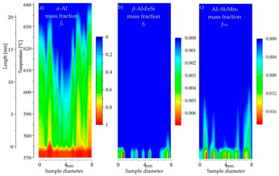 For the specimen AlSi5Fe0.2Mn0.4, α-Al mass fraction fα (Figure 9a) shows a liquid channel in the center, 4 mm wide on top at 625 °C and with rough 2 mm wide bottom at the temperature 602 °C (mass fraction fα = 0.2). The mushy zone seems to range from 575 °C to about 630 °C, and its length is about 17 mm. β-Al5FeSi (Figure 9b) starts to precipitate at about 575 °C and only in one central point (coordinate 4.5 mm) with mass fraction reaching only about fβ = 0.0016. This location in the center agrees qualitatively with the central enrichment in Fe-phases in [21]. The solidification range for Al15Si2Mn4 is about 575–610 °C (Figure 9c) and e.g., mass fraction fMn = 0.01 reached the temperature 605 °C in one point (coordinate 4.5 mm), but also in other points Mn-phases start to precipitate before the solidification temperature 575 °C. The final microstructure shows almost equal mass fraction fMn = 0.015–0.025 of Al15Si2Mn4 and only in one point (coordinate 4.5 mm) it increased to fMn = 0.036. At this point, which has composition AlSi7.6Fe0.57Mn0.55, the temperature for starting of Al15Si2Mn4 growth may even reach 610 °C, which coincides with a low α-Al mass fraction. It therefore seems as if some Mn-phases may nucleate and flow in the liquid channel, but the presence of β-Al5FeSi seems to be impossible.