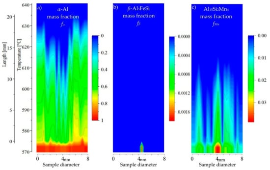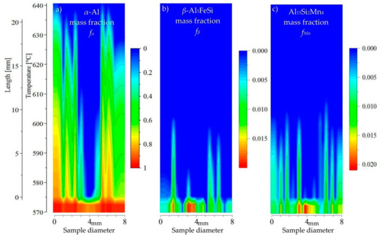2D maps (Figure 8, Figure 9, Figure 10, Figure 11 and Figure 12) were based on the phase mass fraction diagrams prepared for each measured composition (each of 22 points of EDS measurement). The calculated mass fractions were placed according to the position on the longitudinal sections and prepared in graphical software and presented mass fraction of α-Al, β-Al5FeSi, and Al15Si2Mn4 as a function of position across the sample and position along the solidification direction or temperature. As described above, controlled directional solidification enabled the transformation of the temperature axis into the length axis and creation the 2D maps as shown.