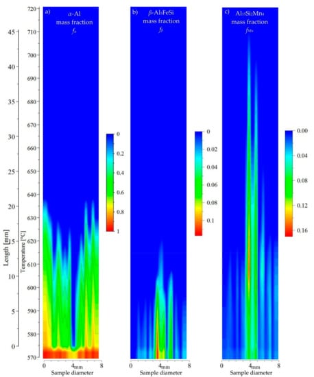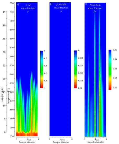 2D maps showing phases mass fraction on longitudinal AlSi5Fe0.2Mn0.2 sample section: (a) α-Al mass fraction fα; (b) β-Al5FeSi mass fraction fβ; (c) Al15Si2Mn4 mass fraction fMn.