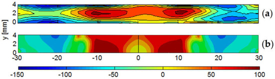 Comparison of the longitudinal residual stress component in the cross section of the welded specimen obtained (a) experimentally via the contour method; (b) from the numerical simulation.