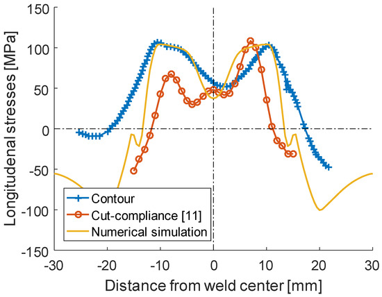 The experimentally obtained results are compared with the longitudinal stress on the cross-section obtained from the numerical simulation, see Figure 5b. It is observed that the overall tendencies and stress levels are very identical. The slightly asymmetric results from the experiment are of course not captured by the symmetric model. However, the bias of the maximum stresses in tension towards the center of the cross-section is not fully obtained by the numerical calculation. This discrepancy is further elaborated on in the discussion chapter, where the origins of this behavior (the actual manufacturing process or artifacts from the contour method) are evaluated. In order to further validate the experimental results, the average cross-sectional longitudinal stress from the experiment and the simulation are compared with previous experimental findings based on the cut-compliance method for the same material and under somewhat similar processing conditions by Sonne et al. [9], see Figure 6. Explained briefly, the cut-compliance method is as the contour method destructive, but the residual stresses are deduced from measured strains (by strain gauges mounted on the specimen) resulting from the relaxation of the residual stresses that were originally present in the workpiece and were caused by a cut introduced along the plane normal to the longitudinal residual stress. The method then consists in computing the original residual stress distribution, which best matches the measured strains. For that cause, the measured strains are converted in residual stresses using an analytical model based on the stress intensity factor solutions from linear elastic fracture mechanics (LEFM).