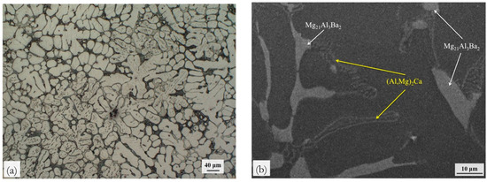 Initial microstructure of the ABaX633 alloy in the as-cast condition: (a) Optical micrograph; (b) SEM image.