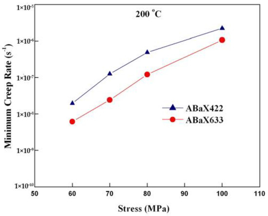Compression creep tests at a high temperature of 200 °C were performed on cylindrical specimens (6 mm diameter and 15 mm length) under various constant stresses of 60, 70, 80, and 100 MPa for ABaX633 alloy and the creep rates that were obtained are shown in Figure 2. For comparison purpose, data on its predecessor alloy ABaX422 is also included in the figure. It is evident that ABaX633 alloy exhibited better creep resistance, i.e., lower creep rate, than ABaX422 at all the applied stress levels.