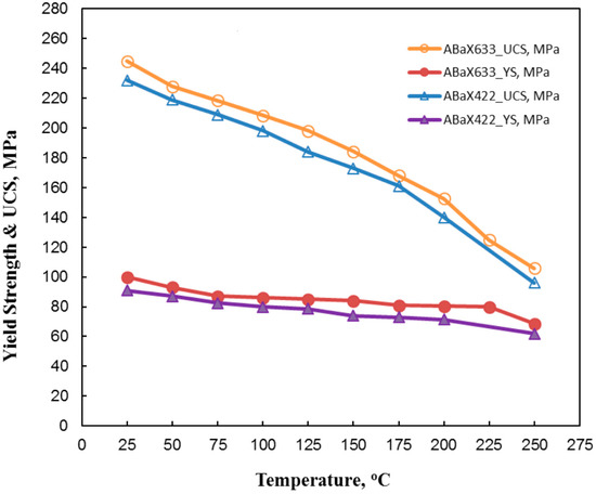 Ultimate compressive strength (UCS) and yield strength (YS) of ABaX633 and ABaX422 alloys.