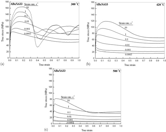 True stress-true strain curves obtained for ABaX633 alloy compressed at various strain rates and at temperatures of (a) 300 °C, (b) 420 °C, and (c) 500 °C.