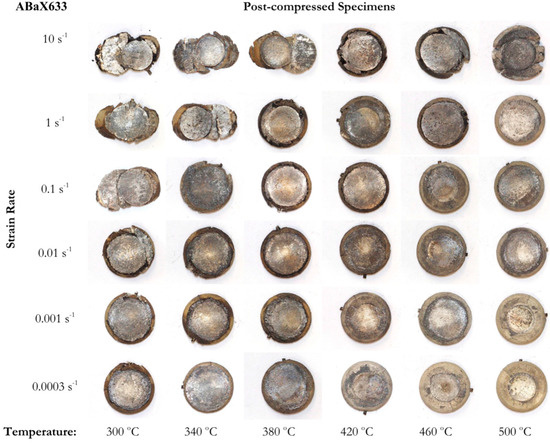 Top View of the ABaX633 alloy specimens compressed at different temperatures and strain rates.