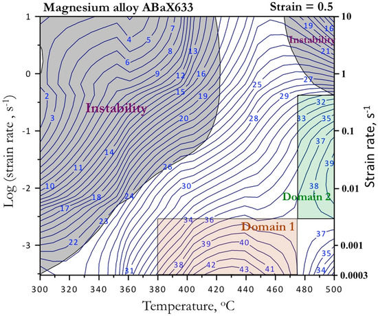 The processing map exhibits two workability domains in the temperature and strain rate ranges of: (1) 380–475 °C and 0.0003–0.003 s−1 with a peak efficiency of 43% occurring at 430 °C/0.0003 s−1, and (2) 480–500 °C and 0.003–0.5 s−1 with a peak efficiency of 39% occurring at 500 °C and 0.01 s−1. Optimum conditions for hot working correspond to those where peak efficiency occurs in these domains.