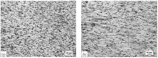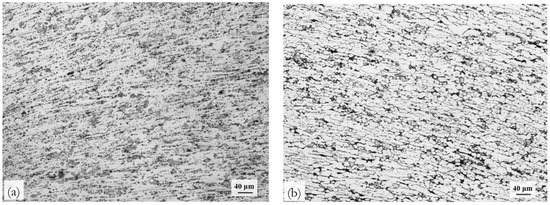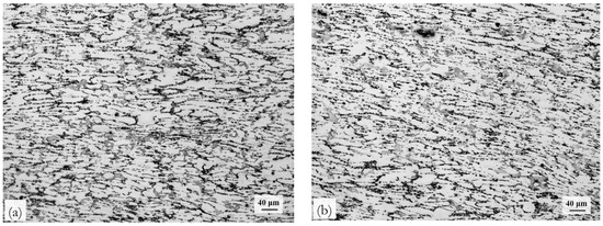Optical microstructures (the compression axis is vertical) of the ABaX633 alloy deformed at (a) 500 °C /0.01 s−1, and (b) 500 °C/0.1 s−1 (Domain 2).