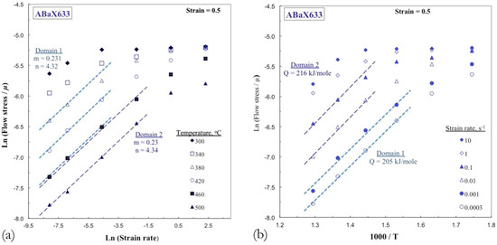 For ABaX633 specimens at a strain of 0.5: (a) Variation of the flow stress with strain rate; (b) Arrhenius plots showing the variation of normalized flow stress with inverse of absolute temperature.