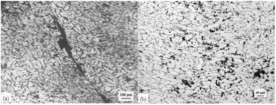 In the second regime of instability that occurred at higher temperatures and strain rates, the manifestation is that of intercrystalline cracking. The microstructure of the specimen corresponding to the conditions 500 °C and 10 s−1 is shown in Figure 10b, which confirms intercrystalline cracking occurring in localized regions. Under these conditions, the material exhibits low workability, as can be seen from the specimen deformed at 500 °C/10 s−1 in Figure 5.