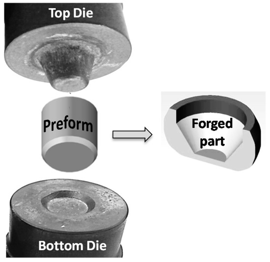 The results obtained from processing maps on the workability domains and the instability regimes are validated by forging a cylindrical preform into a rib-web (cup) shaped component, as shown in Figure 11. The chamfering on the bottom end of preform is to facilitate its accurate positioning on the bottom die. The forging was conducted using a MTS 810 servo-hydraulic machine (MTS, Minneapolis, MN, USA) using a pair of dies, as shown in the figure. An important feature of this semi-open die forging is that most of the material can flow outwards without any constraints. That is, the outer periphery of the deforming preform experiences tensile stresses during the entire forging process except for the small web portion that formed at the bottom of the component that experiences compressive stresses. Details of the overall experimental set up and procedure was given in an earlier publication [11]. The experiments were conducted at different temperatures in the range of 300 to 500 °C and at speeds of 0.01, 0.1, 1.0, and 10 mm/s−1. The specimen, the die assembly, and the loading members were heated to the test temperature by surrounding them with a split furnace.