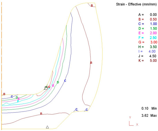 Strain contours obtained in finite element simulation at the end of stroke (11 mm) obtained at temperature and speed of 420 °C/0.01 mm·s−1 (Domain 1).