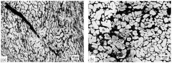 Optical microstructures of the ABaX633 alloy forged at conditions correspond to flow instability in the processing map: (a) 300 °C/10 mm·s−1 and (b) 500 °C/10 mm·s−1. Forging axis is vertical.