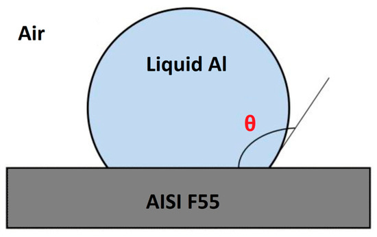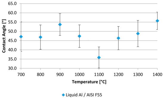 At this working temperature, the contact angle reaches a minimum, testifying a strong interaction between the liquid aluminum and the super duplex stainless steel substrate, which must involve a chemical bonding component [31].