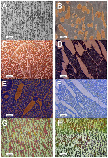 Optical microscopy highlights the complexity of the microstructure featuring this steel grade and its interaction with liquid aluminum. Both the thermal treatments and the mechanical deformation (cold rolling) drastically modify the microstructure. The commercial cold drawn samples display the typical “pancake” microstructure featuring cold worked duplex and super duplex stainless steels (Figure 4A). In the samples solubilized at 1400 °C, the austenitic phase is present in lower volume fractions and surrounds the ferritic grains as allotriomorphs or it enters within the grains as Widmanstätten γ-austenite plates (Figure 4C). The solubilized at 1300 °C specimens reveal a microstructure, which is featured by roundish austenitic grains dispersed within the ferritic matrix (Figure 4B). In the annealed thermally treated samples, the secondary austenite precipitation has been trigged (Figure 4D) and it is followed by the precipitates competitive growth with the ongoing of the thermal treatment. At 210 s/mm (Figure 4E), a static recovery of the ferritic grains is reported to occur and, then, the competitive coarsening of austenitic grains leads the microstructure evolution until 360 s/mm (Figure 4F) of holding time [26,36]. Moreover, the effect of the deformation by the cold rolling can be detected, observing the distortion of the austenitic grains, which is more marked in the samples experiencing higher strains (Figure 4G,H).