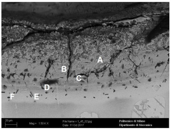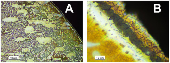 Focusing the attention at the specimens’ surfaces, it is possible to observe at low magnifications the enrichment at the surface in ferrite volume fraction. This phenomenon is related to the diffusion of aluminum within the substrate. Indeed, the aluminum is a strong ferrite-stabilizer element; thus, it promotes the decrease of the austenitic phase content, even if present in very low percentages. The clear appearance of this fact allows the measurement of a surficial layer in which aluminum is diffused (Figure 5A).