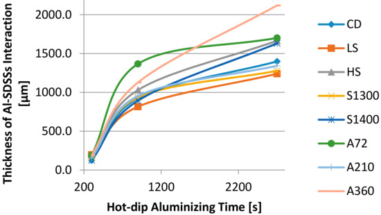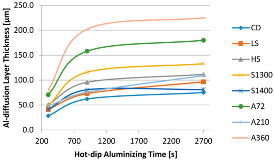 Further data can be obtained measuring the other features highlighted by micrographic analysis of the hot-dip aluminized surfaces. In detail, the external layer enriched in the ferritic phase, generated by the increase of the local aluminum content via diffusion, has been estimated. Data are shown in Figure 6.
