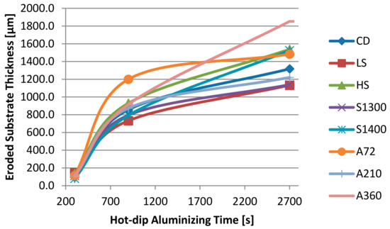 Finally, the thickness of the super duplex stainless steel substrates eroded by liquid aluminum during the hot-dip aluminizing process, as the distance from the projection of the initial surface and the final surface, has been measured. The results are reported in Figure 8.