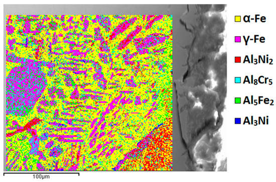 Finally, a SEM/EBSD map has been collected at the surficial aluminum-rich layers of the super duplex stainless steel substrates of the sample annealed at 1080 °C for 360 s/mm and aluminized at 1100 °C for 2700 s, to identify and quantify through diffraction the constituent phases. The gathered data are displayed in Figure 12. Due to the complexity of the chemical system, the detected phases are considered as random substitutional solid solutions, with separate chemical and magnetic contributions to the excess Gibbs energy. This means that, in lattices, atoms may be replaced by other different elements, without changing the lattice structure of the phase. Thus, thanks to the literature, phases may be grouped by the lattice system in the following list: α-Fe (b.c.c.), γ-Fe (f.c.c.), Cr5Al8 (b.c.c.), Fe2Al5 (orthorhombic), Al3Ni2 (h.c.p.), and FeAl3 (monoclinic).