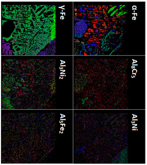SEM/EBSD detects phases as random substitutional solid solutions, due to the chemical complexity of the system. However, the Al diffusion can be observed through the phases maps. The distribution of the Al-rich phases (Figure 15), such as Fe2Al5 (orthorhombic) and Al3Ni, is concentrated near the surface. On the other hand, Al-poor phases, such as Cr5Al8 (b.c.c.) and Al3Ni2 (h.c.p.), are mainly located in the innermost layers of the SDSS substrate, testifying the occurrence of the diffusion phenomena in hot-dip aluminizing. Further, comparing the Al3Ni and α-Fe (b.c.c.) phases maps, the location of this Al-rich phase linked to the α-Fe (b.c.c.) grain boundaries should be underlined. This demonstrates the major role played by the short-circuit diffusion paths in this process [35].