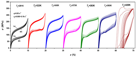 11.5 SMA, a series of tensile cycle tests were carried out between the temperature range from 291 to 420 K, and the results are subsequently drawn in