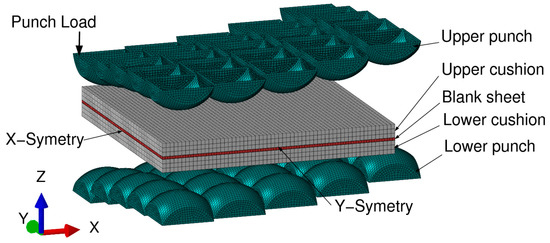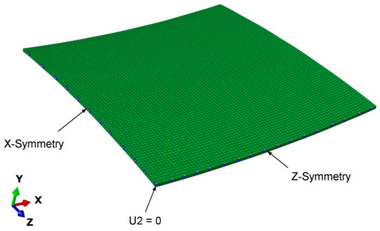 While the loading process is conducted, a deformable blank sheet was brought into contact with a pair of deformable elastic cushions and the cushion also in contact with the rigid upper and lower discrete punch elements. The contact friction coefficient between the blank and elastic cushion, and elastic cushion and punch is considered as 0.1 [19]. Blank sheet and elastic cushions are meshed using C3D8R solid element and R3D4 shell element is also used for the rigid punch element. To reduce the computational time, as shown in Figure 2, the symmetrical condition is considered. For x-symmetry, the translational displacement in the x-direction, and rotational in y-direction and z-direction were set to zero (Ux = URy = URz = 0), and under y-symmetry, translational displacement in y-direction, and rotation in x-direction and z-direction were set to zero (Uy = URx = URz = 0). After the completion of the loading process using explicit analysis, the deformed shape, strains, and stresses within the blank elements were transferred into the implicit analysis for unloading process. This was accomplished by creating a database file that updated the geometry and stress-strain history of the implicit elements to match the final explicit solution. During the implicit analysis, the punches and elastic cushions were removed from the model and valid boundary conditions were employed to the sheet blank to restrain rigid body motion. As shown in Figure 3, the displacement in y-axis (U2) at the center of the nodes are fixed, and the X-symmetric and Z-symmetric are also imposed, as shown in the figure. Finally, the implicit analysis was exploited to determine the succeeding springback displacement in the deformed blank that occurred after the forming load was removed. The FE simulation model was experimentally validated in our previous study [17,18].