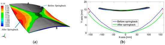 Case of visible springback: (a) Nodal displacement distribution; (b) Curvature radii at section AB.