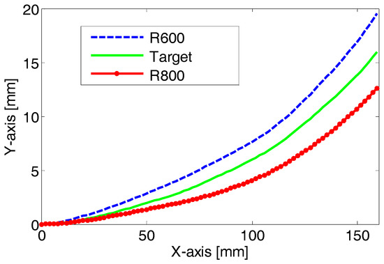 Target curvature radius with the deformed result of R = 600 mm and R = 800 mm curvature radius after springback.s