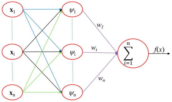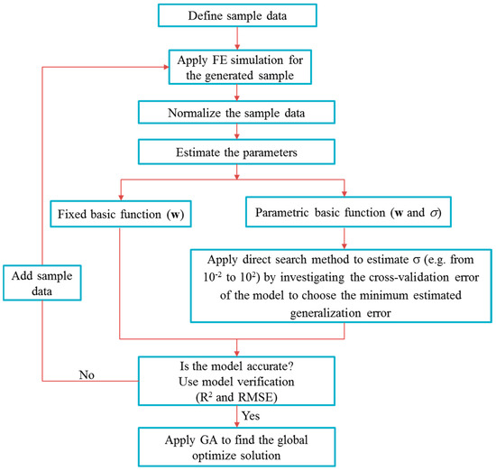 RBF was first introduced by Rolland Hardy to fit irregular topographic contours of geographical data [20]. RBF networks are three layer feed-forward networks that are trained using a supervised training algorithm, which is shown in Figure 8, featuring are an input x, hidden units Ψ, weights w, linear output transfer functions, and output f(x). To construct the fitting model using RBF, we first consider the scalar response function f or the yielding responses y = {y1, y2, …, yn}T which is obtained from the simulation or experimental results by employing the input training sample data of X = {x1, x2, …, xn}T. Then, we pursue RBF approximation function , which is given as