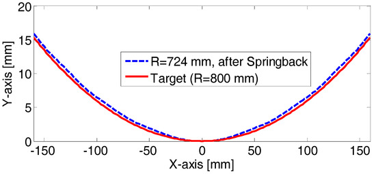 To compensate the induced springback value, the only option in MDF is changing the curvature radius. Here, the study target curvature radius is 800 mm. To check the upper and lower value, the study conducted two FE simulations. As shown in Figure 6, the study target curvature is between the simulation result of 600 and 800 mm curvature radii after springback. So, the study searches the optimal radius value in between 600 and 800 mm curvature radius for different blank thickness. The considered blank thickness in this study is in between 0.5 and 2 mm. The process parameters are summarized in Table 2.