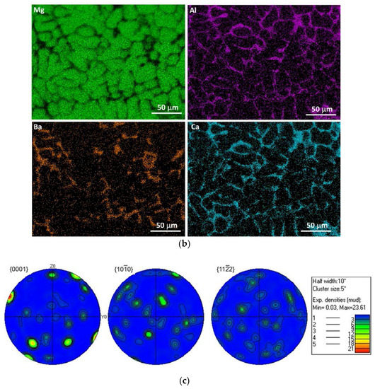 (a) SEM-EDS (SEM: Scanning Electron Microscopy; EDS: Energy Dispersive X-Ray Spectroscopy) map of the initial microstructure consisting of the ternary phase Mg21Al3Ba2 and the lamellar eutectic phase (Al,Mg)2Ca; (b) elemental image maps; and (c) texture of the as-cast ABaX422 alloy.