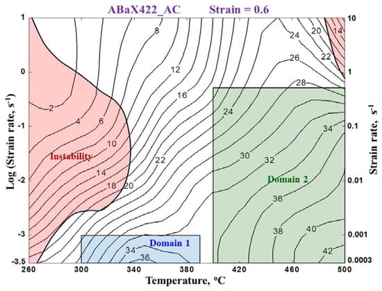 Processing map for the ABaX422 (Mg-4Al-2Ba-2Ca) alloy obtained at a strain of 0.6. The numbers associated with the contours indicate the efficiency of the power dissipation in percent through microstructural changes occurring during deformation.