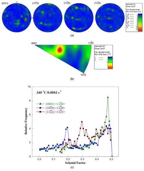 Texture measurements on specimen deformed at 340 °C/0.0003 s−1 (peak efficiency condition for Domain 1): (a) pole figures; (b) inverse pole figures; and (c) Schmid factor distribution.