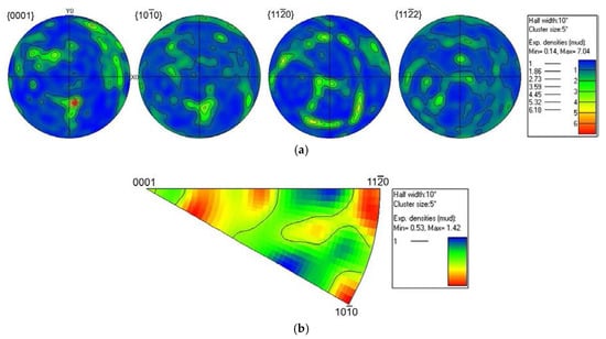 Texture measurements on specimen deformed at 460 °C/0.01 s−1 (in Domain 2): (a) pole figures; (b) inverse pole figures; and (c) Schmid factor distribution.