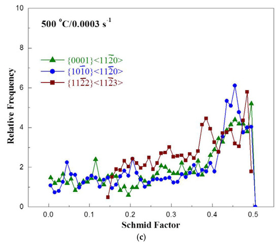 Texture measurements on specimen deformed at 500 °C/0.0003 s−1 (peak efficiency condition for Domain 2): (a) pole figures; (b) inverse pole figures; and (c) Schmid factor distribution.