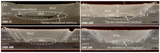 The comparison of macrostructure of Al/steel lap joint with different welding parameters. (a) 1000 rpm, 25 mm/min; (b) 1000 rpm, 200 mm/min; (c) 1000 rpm, 400 mm/min; and (d) 600 rpm, 200 mm/min.