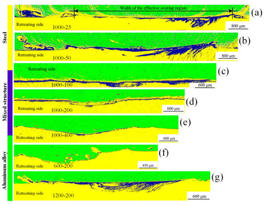 Figure 4 shows the macrostructure of the interface of lap joints. The welding parameters had a major influence on the flow and mixing of the materials. Chaotic mixed structures are present in Figure 4a,b,g. High frictional heat was generated when welding speed is low and rotation speed is high, which can make materials become plastic and mix disorder. Higher rotation speed also produced more vertical mixing between upper aluminum and lower steel. The occurrence of non-continuous IMCs and chaotic structures are more serious at the advancing side than that at the retreating side of the joint. Arora et al. [23] and Nandan et al. [24] indicated that the interfaces at the center region and advancing side under the stir pin were stirred more severely than that at retreating side. Figure 4a–e shows that when welding speed was decreased to 100 mm/min, more diffusion time and heat input were provided for the growth of IMCs along and across joint interface and non-continuous IMCs became sufficiently dense to form a continuous layer.
