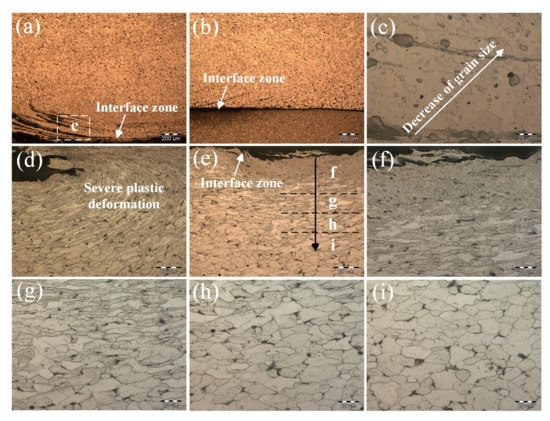As indicated in Figure 5, dynamic recrystallization occurs in the steel surface. The α-Fe fine grain size in the steel close to the interface can be attributed to the heavy plastic deformation produced by the rotating convex pin. The dynamic recrystallization occurred as a result of the combined effects of pin stirring and frictional heat. Furthermore, grain size increases from Al/steel interface to steel base metal due to a decrease in deformation strain rates and heat input. The WNZ in steel side also showed layers of different textures accompanied by changes in grain shape, as shown in Figure 5d–f. In Figure 5f–i, with the distance increasing from weld interface, shear texture components became less identifiable.