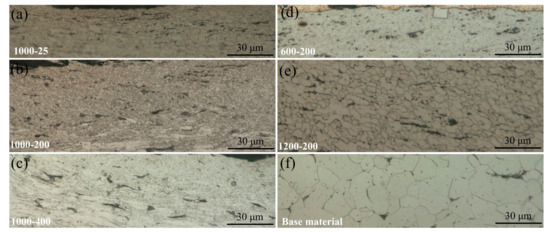 As shown in Figure 6, with the increase of rotation speed, steel grains under the interface coarsened, which was due to the increased heat input. The average grain size in fine-grain zone of the steel at a rotation speed of 1000 rpm was less than 1 μm, while it was approximately 3 μm at a rotation speed of 1200 rpm. In contrast to rotation speed, increasing welding speed decreased heat input and deformation strain rate, which in turn decreased grain size and decreased the zone area of steel fine grain.